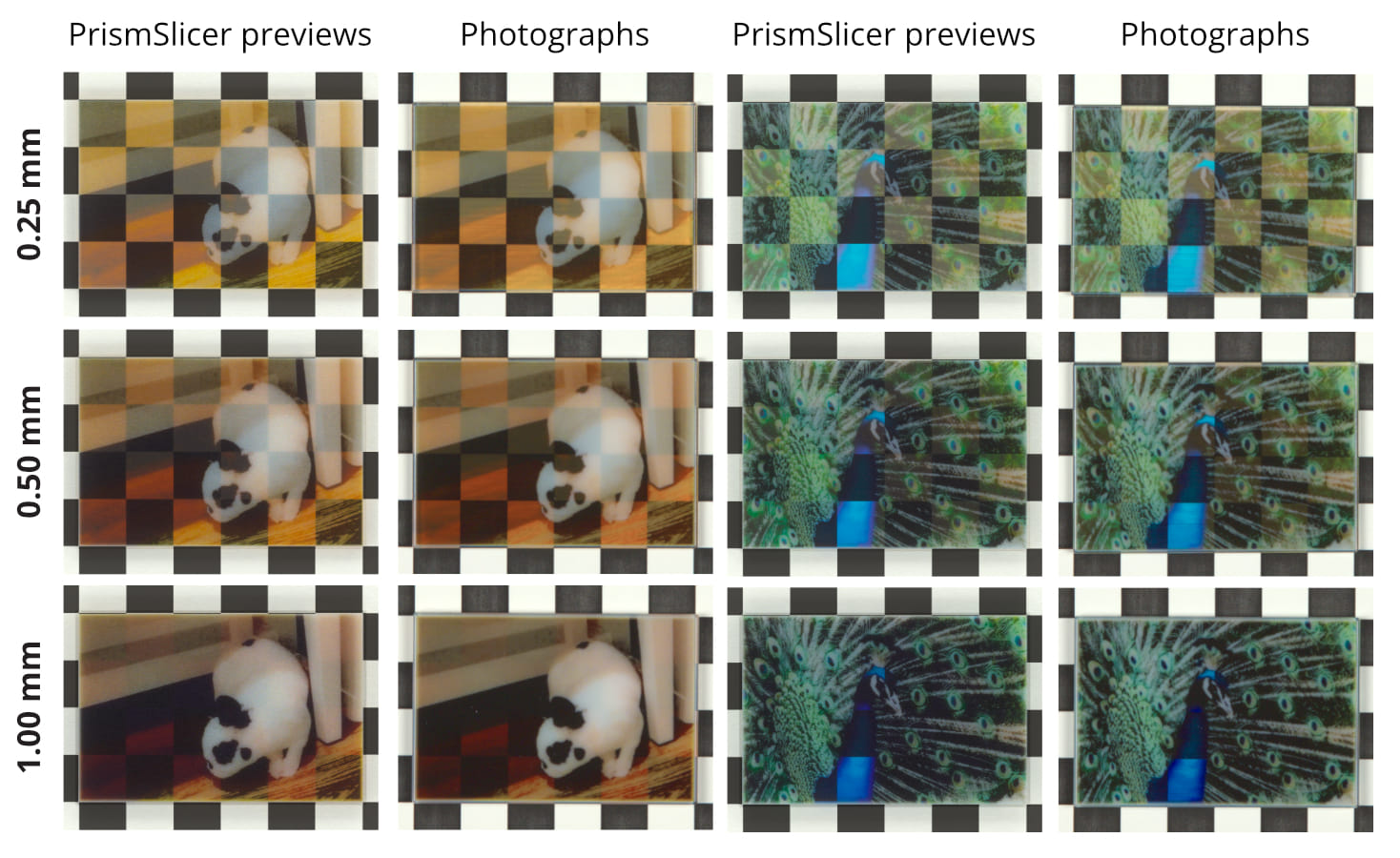 You can do the same with any 3D model of your choice. For example, we can preview the translucency of very thin printouts. For this experiment, we loaded two models, one with a photo of a bunny, the other with a photo of a peacock. We sliced them in PrismSlicer and extruded the colors throughout the entire object. We have done the same for three different thicknesses: 0.25, 0.50, and 1.00 mm (0.01, 0.02, and 0.04 in). Let’s see how these printouts look when we place them on a black and white checkerboard paper: